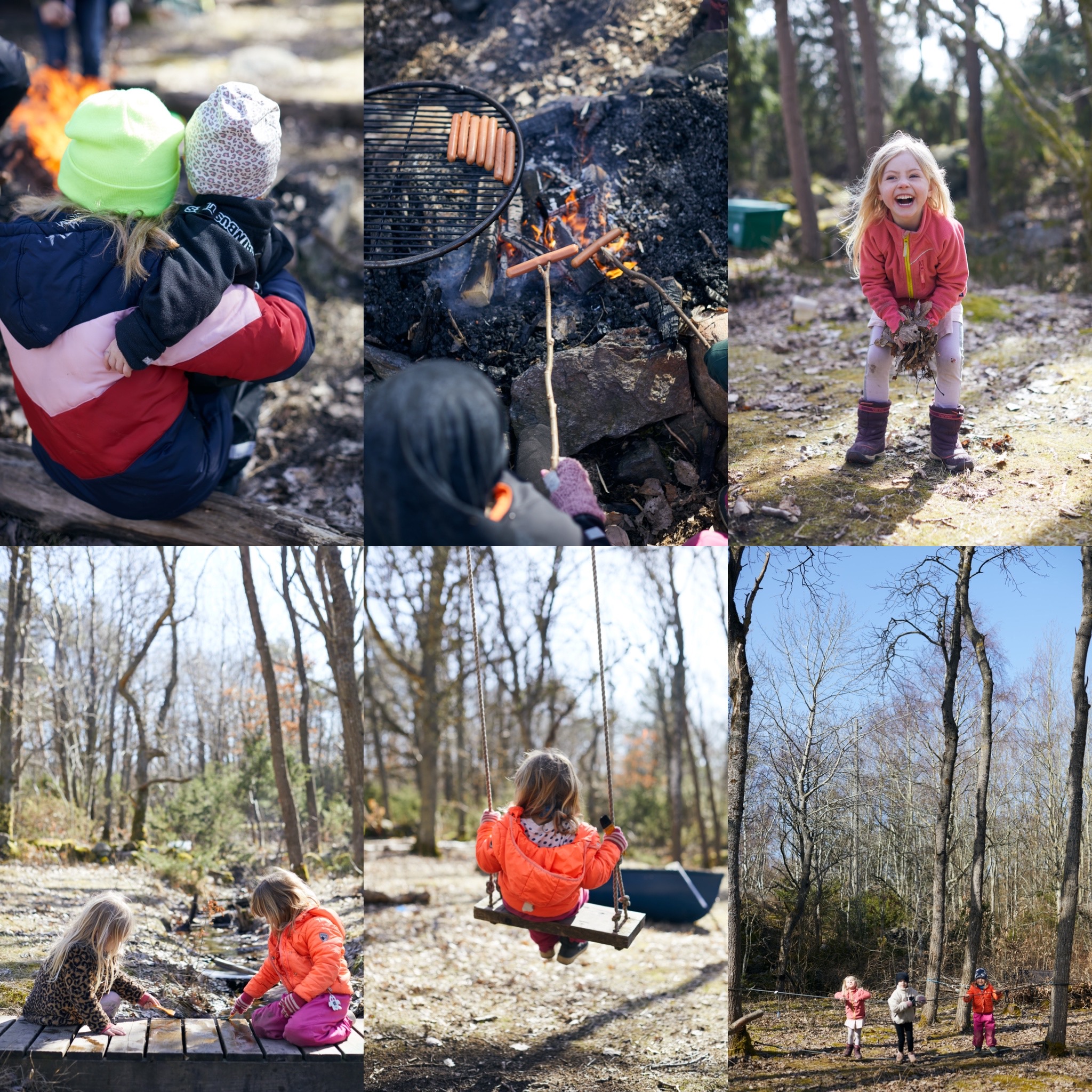 Vi är ute en stor del av dagen, på gården eller på vår skogsplats en hel dag i veckan. Promenad på ön är en populär aktivitet – en bestigning av berget till vattentornen eller en visit hos öns grisar och får ger spännande upplevelser. Ibland tar vi färjan till Kalvsund och deras fina lekplats. Då och då ger sig barnen också iväg till utflyktsmål längre bort på andra öar eller i stan och besöker lekplatser, går på barn-bio och bibliotek.